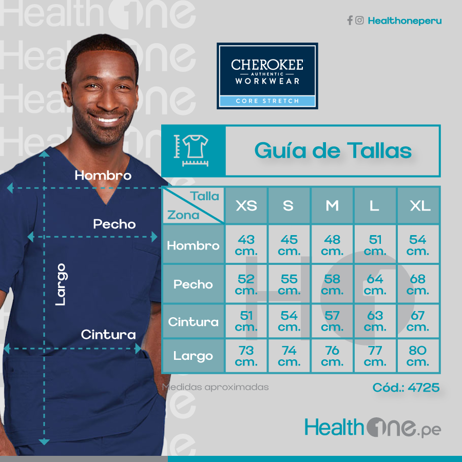 Chaqueta cuello V, un bolsillo en el pecho izquierdo con presilla para instrumentos y lapicero, dos bolsillos inferiores (incluye un bolsillo adicional para instrumentos / celular en el lado derecho), aberturas laterales en la basta.